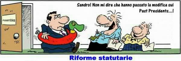 Al momento di andare in onda ancora la richiesta ufficiale di indizione dell' Assemblea non e' stata ancora avanzata ufficalmente dalle 4 sezioni. Un testo della prima bozza e' stato comunque gia' circolato: vi sono alcune novita' di rilievo, come la limitazione ad uno (l'ultimo) dei Past President inclusi di diritto nel Consiglio, la elezione diretta del Presidente, l' istituzione di collegi elettorali regionali (o pluri-regionali) a numero di candidati prefissato per